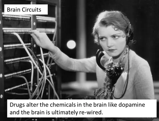 Every addictive substance acts on a chemical in the brain called dopamine. Those drugs that release a LOT of dopamine and act VERY quickly tend to be more addictive. This is because dopamine helps our brains decide what gives us pleasure, what is rewarding, and what we should be paying attention to in the world. It is what causes feelings of satisfaction and pleasure when we connect with friends, do an activity we enjoy, achieve a goal, eat, or love someone. These things feel good and so we want to do them more. This is beneficial to humans as these things are essential to human survival: building communities with others, seeking out food, and forming families helped the human race survive. BUT. The amount of dopamine released by the drug is WAAAAAYYYY more than what is released by these other activities. Our brain interprets this to mean this drug must be WAAAAAYYY better and more important than all those other things. If the drug continues to be present, over time the brain literally re-wires itself. This ability for brains to change over time is called ‘brain plasticity’. Now the brain is constantly seeking signs of the drug and figuring out how to get the drug and thinking about the drug. Additional changes that affect rational thinking, make one more impulsive, and cause chronic stress also happen. The longer the drug is used and the more of it that is used, the more these circuits strengthen. And those other, normal things no longer really cause the same level of pleasure response anymore. You can’t feel the drop of water when you are drowning in the ocean.