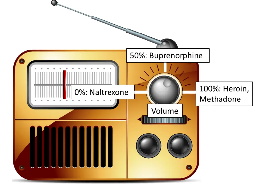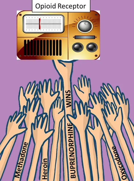 Imagine the opioid receptor as a radio again: Buprenorphine turns the volume up only half-way to 50% unlike methadone and heroin which turned the dial up all the way to 100%. Now imagine that you have three hands going to adjust the volume of the radio: heroin, methadone, and buprenorphine. Buprenorphine will always slap those other hands out of the way and grab the dial, turn it to 50%, and then it will NOT let go. If the heroin hand was already there holding the dial at 100% volume, buprenorphine will push its hand out of the way, grab the volume dial, and turn it down to 50%. That sudden drop from 100% to 50% causes withdrawal.