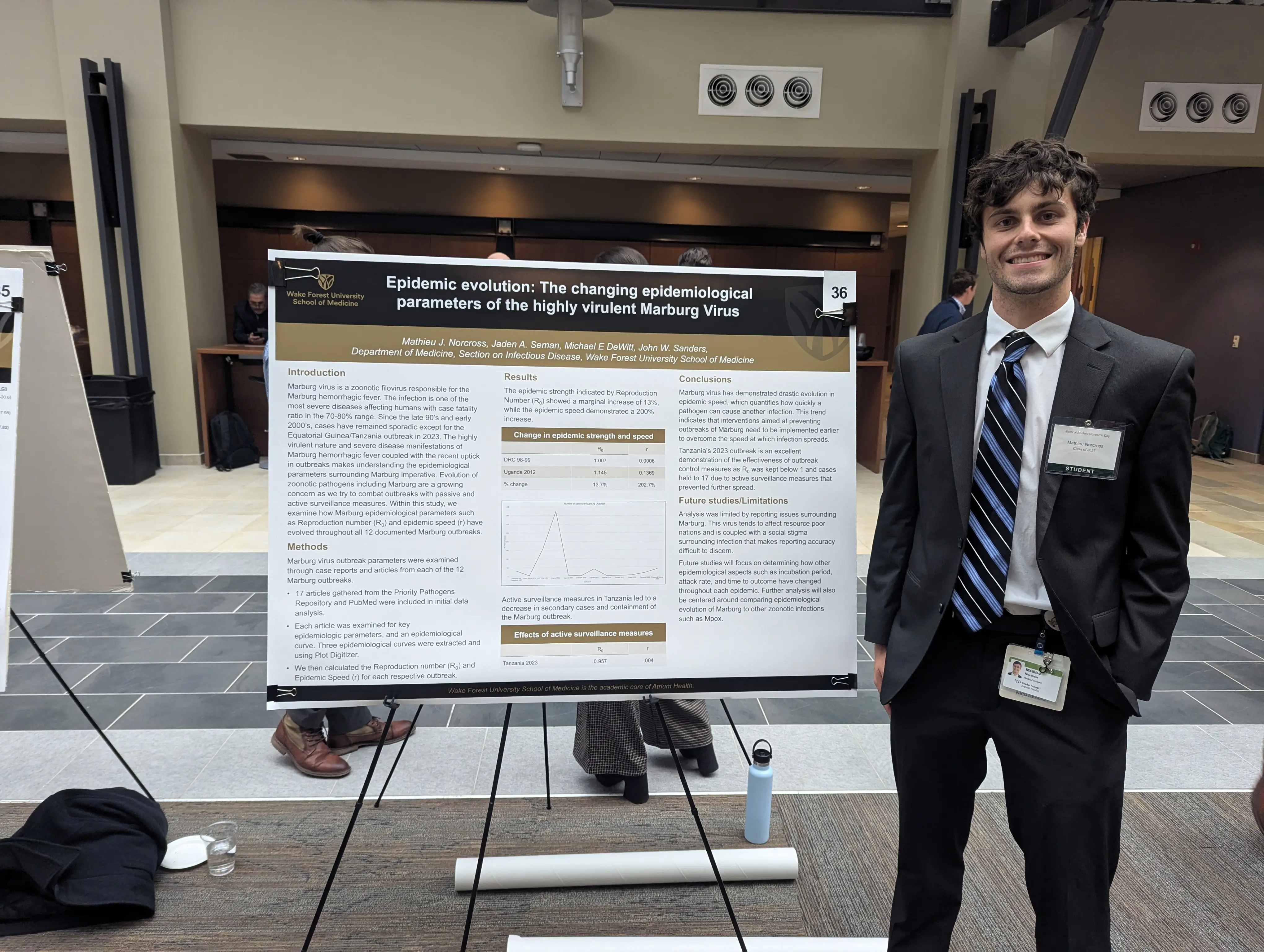 Jaden Seman presented his poster “Apoxalypse: Evaluating the evolution and transmission dynamics of Mpox and its pandemic potential” at the Medical Student Research day. This work was mentored by Michael E. DeWitt, John W. Sanders, and Thomas F. Wierzba.