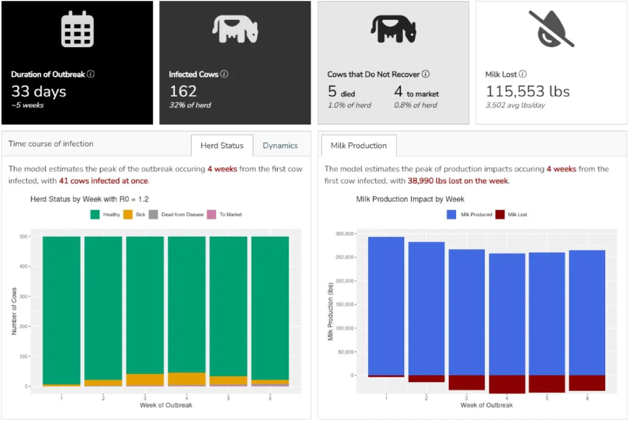 In the first preprint, they provide the first estimates of the basic reproduction number (R0) and other epidemiologic parameters for H5N1 in dairy cows and show that the virus can spread rapidly within herds1. As part of this work, they developed a web application that allows users to simulate the spread of H5N1 in dairy herd.