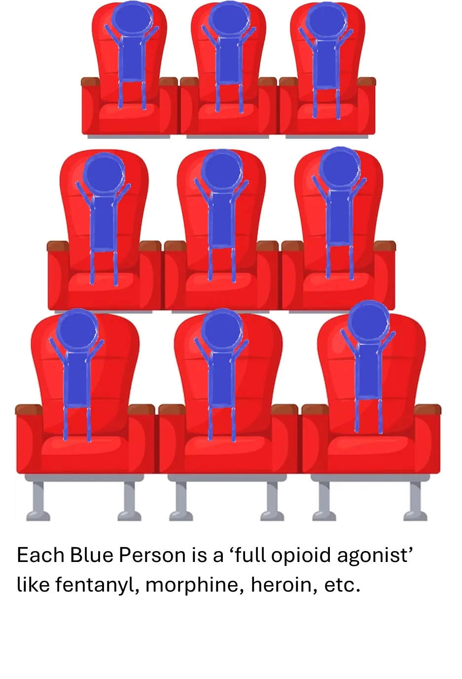 Fentanyl throws off the balance because it is more potent than heroin. You need a lot less fentanyl (maybe 100 times less) to get the same effect as heroin. That is why drug cartels like it: they can make it cheap and don’t need to use as much of it= more profit for them. People aren’t that exact though – they are using more than they would need to get the ‘exact same effect’ as heroin. It’s why overdoses are so much more common when fentanyl is present. So in our thought experiment it is almost like we have 2 fentanyls sitting in each chair where we would have had only 1 heroin. Our theater now looks like this: