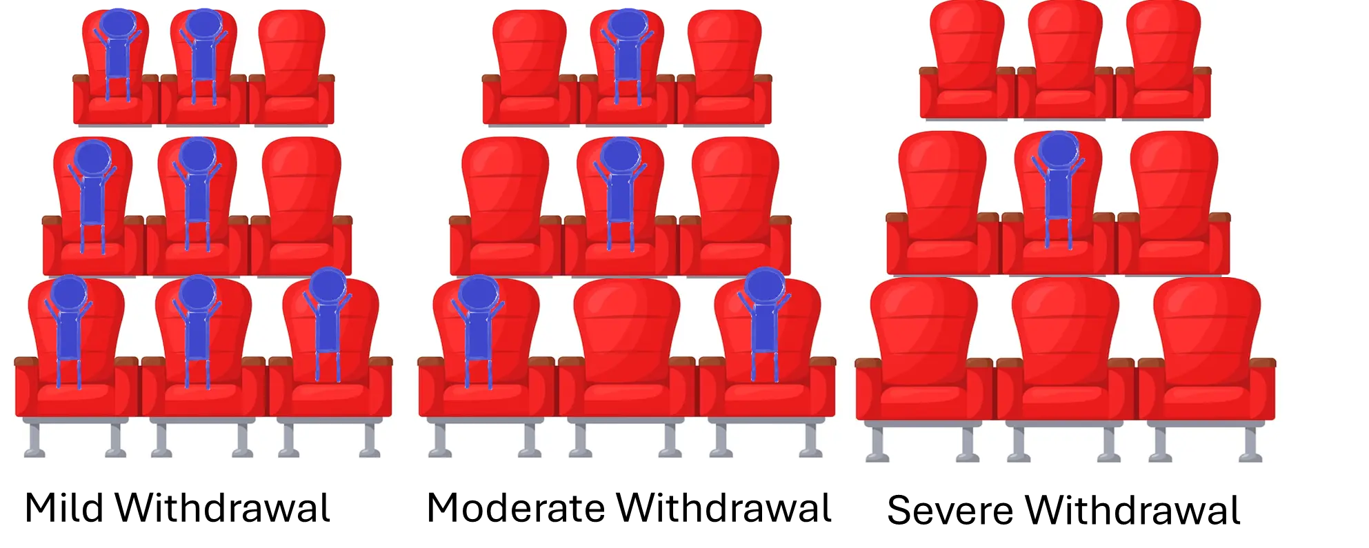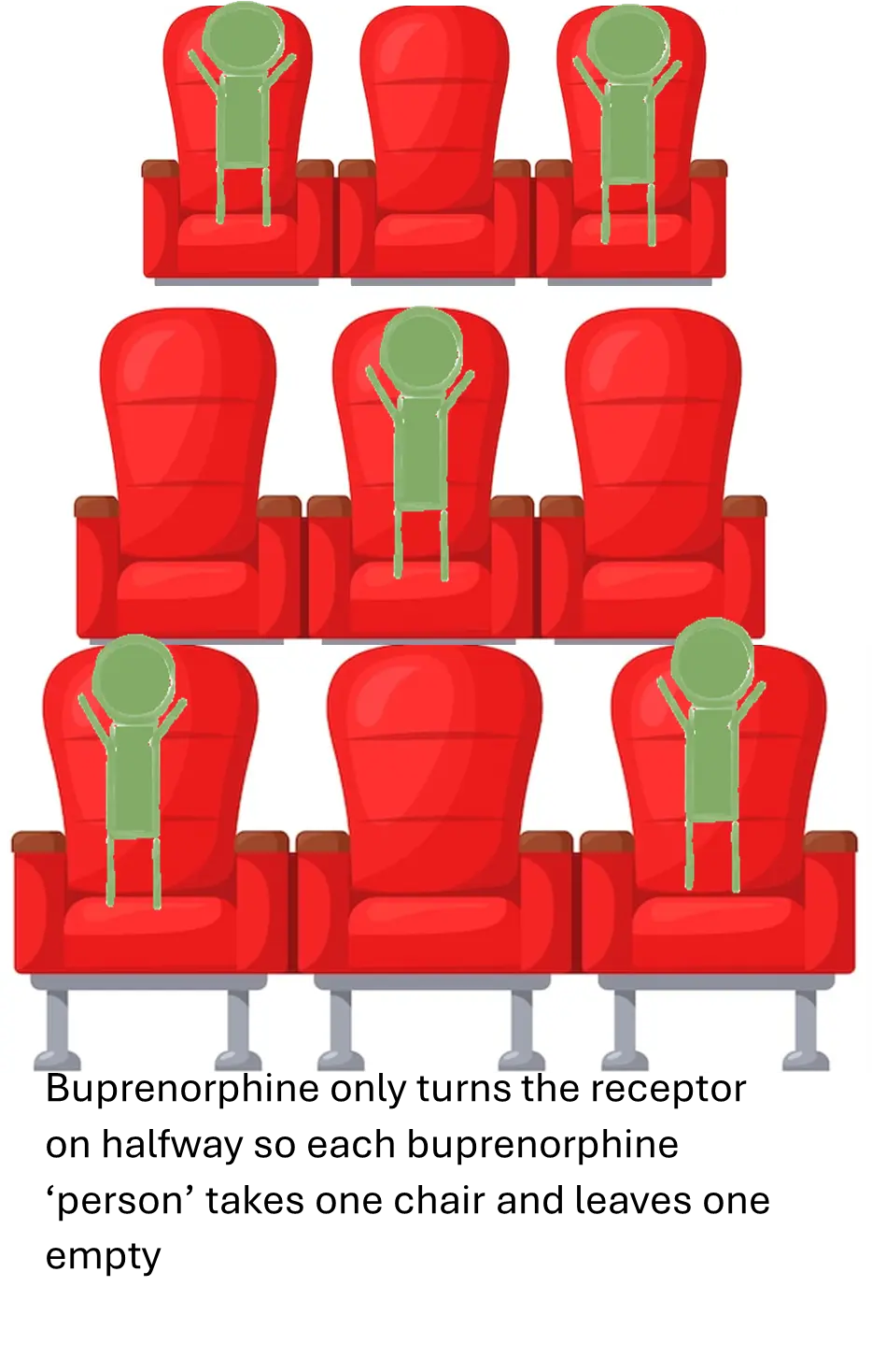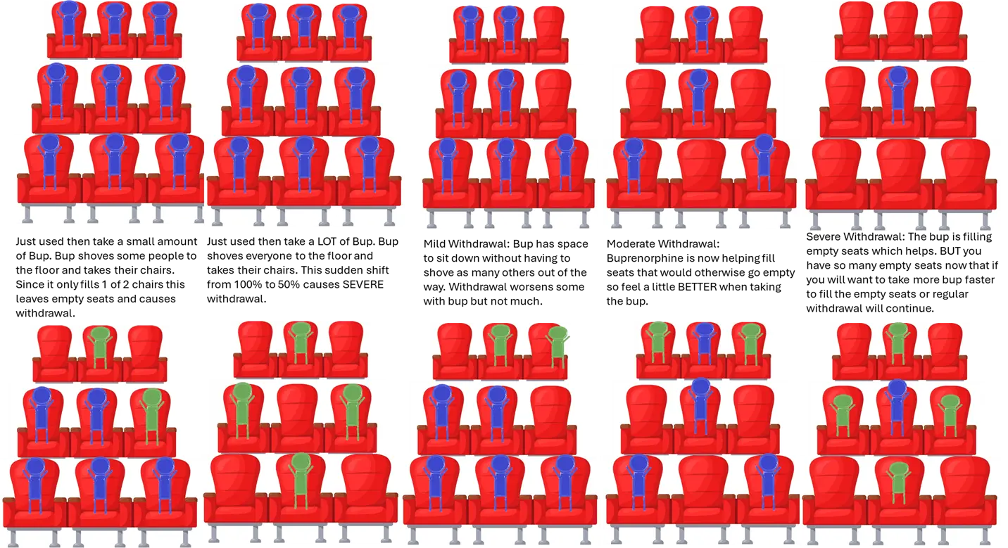 Well Imagine your brain opioid receptors are like the seats in a movie theater-each chair is an opioid receptor in your brain. Imagine when I give you hydromorphone, heroin, methadone, etc. it is putting a person in the chair. In advanced addiction, the person feels ‘normal’ and not sick when the receptors (chairs) are filled. Buprenorphine is different. It only turns the receptor on halfway. So to visualize that lets imagine that each time a buprenorphine sits down it causes the neighboring chair to go empty.