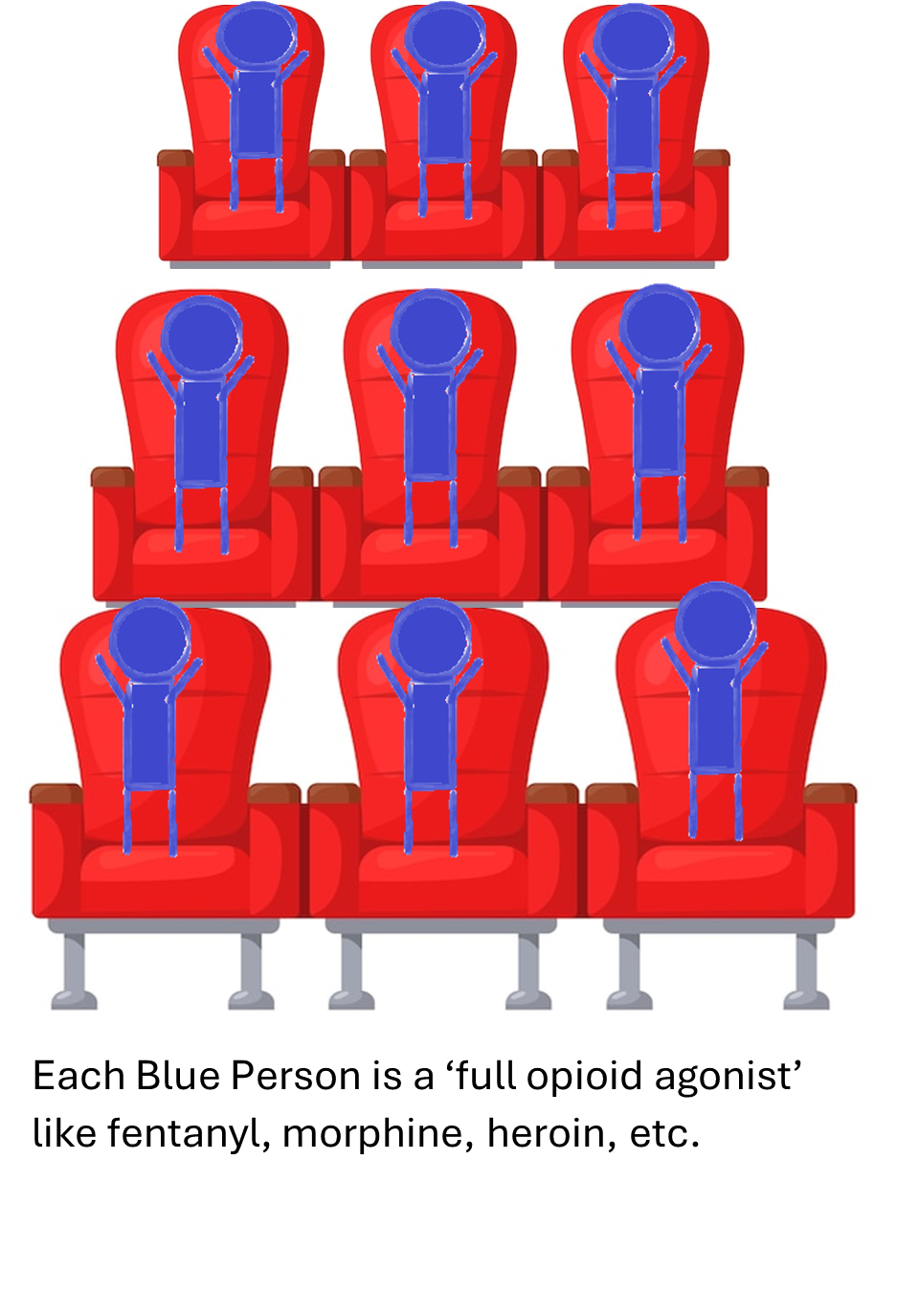 Fentanyl throws off the balance because it is more potent than heroin. You need a lot less fentanyl (maybe 100 times less) to get the same effect as heroin. That is why drug cartels like it: they can make it cheap and don’t need to use as much of it= more profit for them. People aren’t that exact though – they are using more than they would need to get the ‘exact same effect’ as heroin. It’s why overdoses are so much more common when fentanyl is present. So in our thought experiment it is almost like we have 2 fentanyls sitting in each chair where we would have had only 1 heroin. Our theater now looks like this: