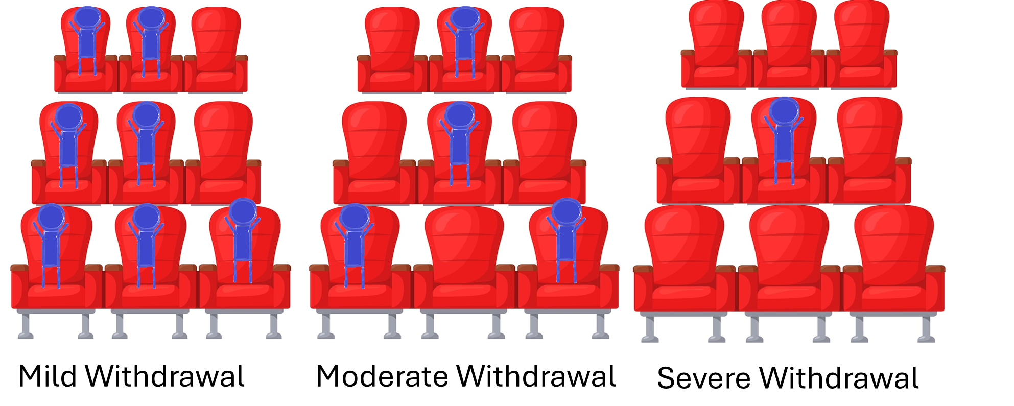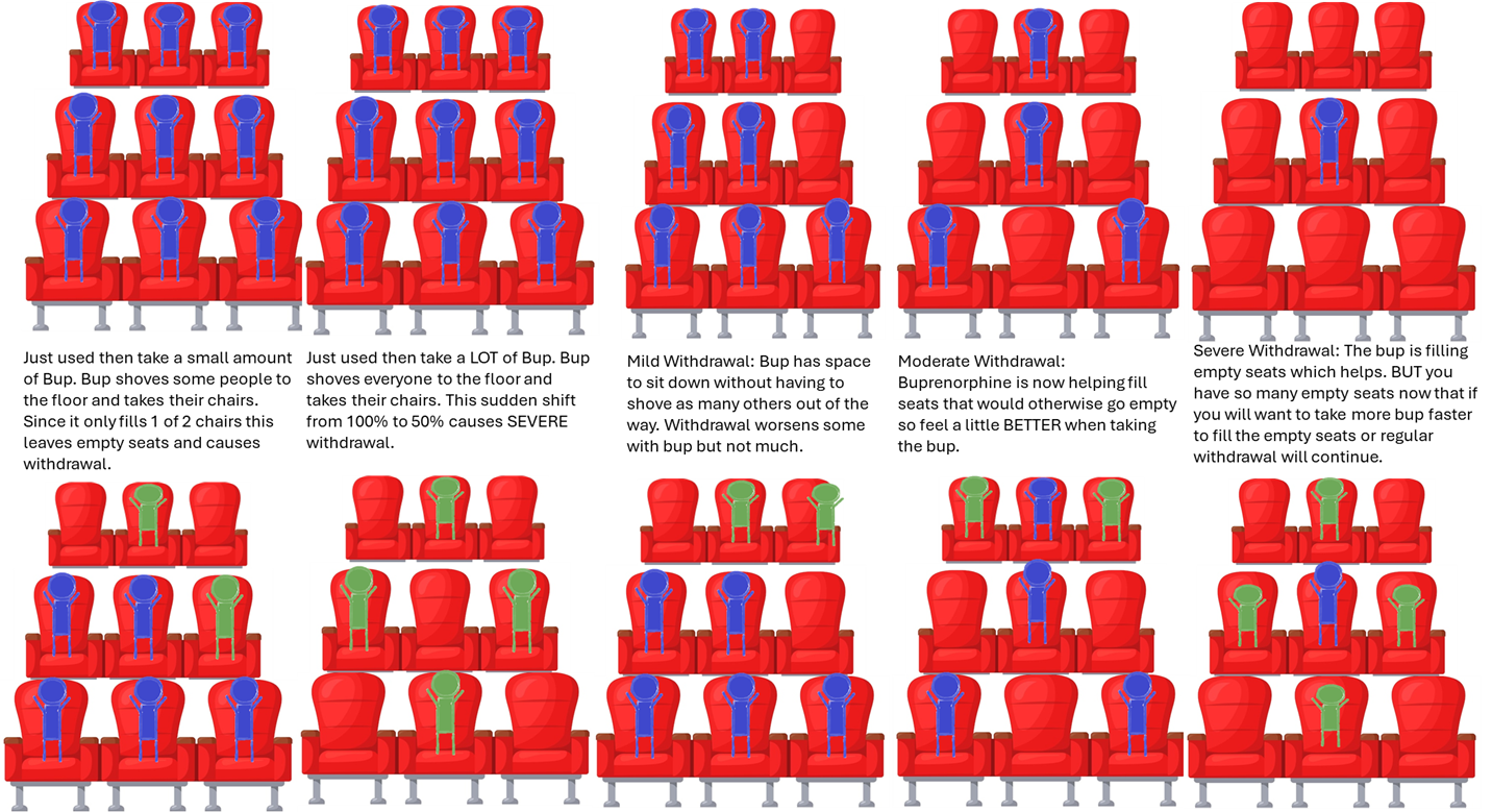 Well Imagine your brain opioid receptors are like the seats in a movie theater-each chair is an opioid receptor in your brain. Imagine when I give you hydromorphone, heroin, methadone, etc. it is putting a person in the chair. In advanced addiction, the person feels ‘normal’ and not sick when the receptors (chairs) are filled. Buprenorphine is different. It only turns the receptor on halfway. So to visualize that lets imagine that each time a buprenorphine sits down it causes the neighboring chair to go empty.